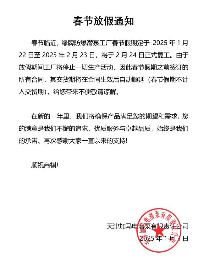 春節(jié)臨近,綠牌防爆潛泵工廠春節(jié)假期定于 2025年1月22日至2025年2月23日,將于2月24日正式復(fù)工。由于放假期間工廠將停止一切生產(chǎn)活動,因此春節(jié)假期之前簽訂的所有合同,其交貨期將在合同生效后自動順延(春節(jié)假期不計入交貨期),給您帶來不便敬請諒解。