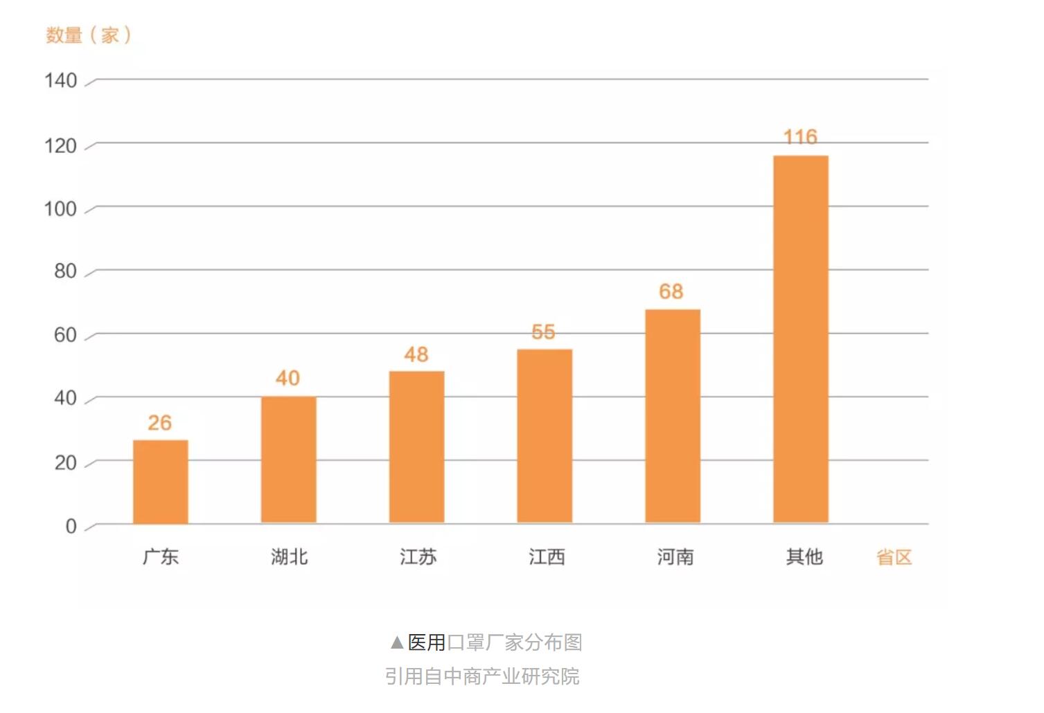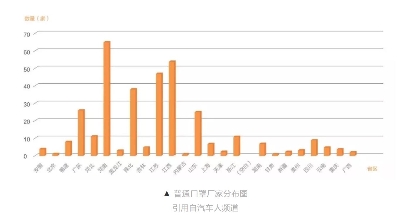 中國是一個口罩產(chǎn)業(yè)大國,生產(chǎn)了全球約50%的口罩。在疫情發(fā)生之前,中國口罩最高日產(chǎn)為2000多萬只。數(shù)據(jù)顯示,2015-2019年中國大陸地區(qū)口罩產(chǎn)業(yè)產(chǎn)值增長率在10%以上。2019年,中國大陸地區(qū)口罩產(chǎn)量超過50億只,產(chǎn)值高達(dá)102.35億元。最快的口罩生產(chǎn)速度120-200只/秒,但一個解析消毒的標(biāo)準(zhǔn)流程卻需要7天到半個月。因為醫(yī)用口罩采用環(huán)氧乙烷滅菌,滅菌后,口罩上會有環(huán)氧乙烷殘留,不但刺激呼吸道,還有致癌物。這樣一來,就必須通過解析方式,使殘留的環(huán)氧乙烷釋放,達(dá)到安全含量標(biāo)準(zhǔn),經(jīng)檢測合格后,才能出廠上市。下圖為普通及醫(yī)療口罩生產(chǎn)廠家分布圖。