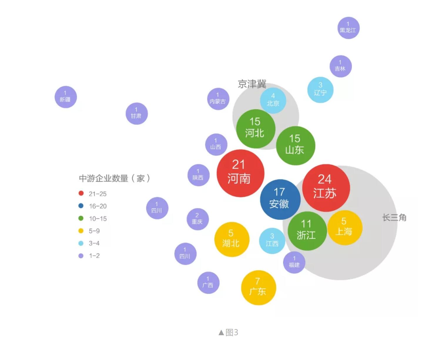 在中游,長三角地區(qū)是醫(yī)用口罩產(chǎn)業(yè)鏈中游企業(yè)分布最集中的區(qū)域,企業(yè)總量占比達(dá)40%。其中,江蘇省、河南省企業(yè)分布數(shù)量最多,分別為24家、21家(如圖3)。