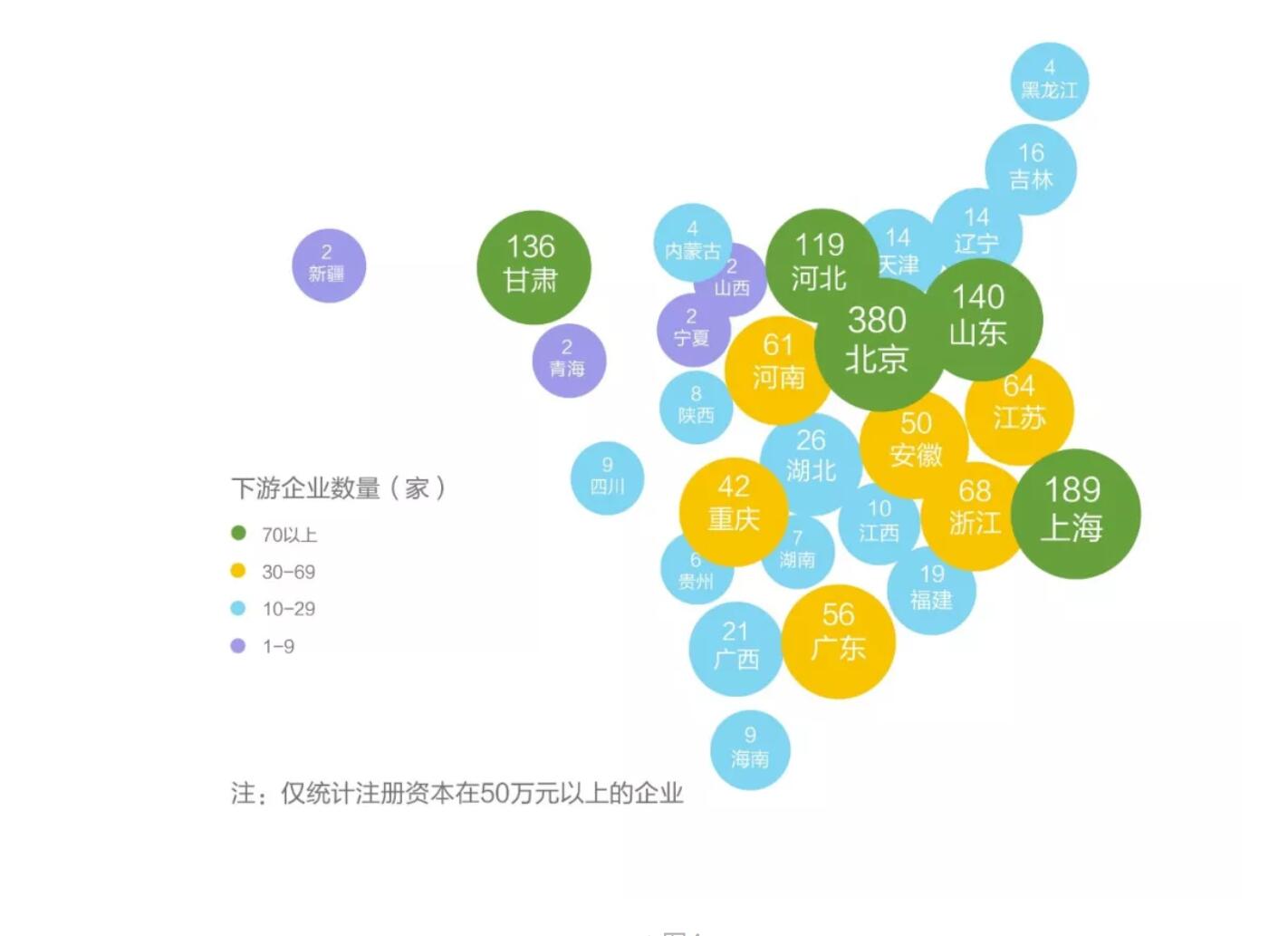 在下游,長三角、京津冀地區(qū)是醫(yī)用口罩產(chǎn)業(yè)鏈下游企業(yè)分布最集中的區(qū)域,企業(yè)總量占比達(dá)64%。其中,北京、上海企業(yè)分布數(shù)量最多,分別為380家、189家(如圖4)