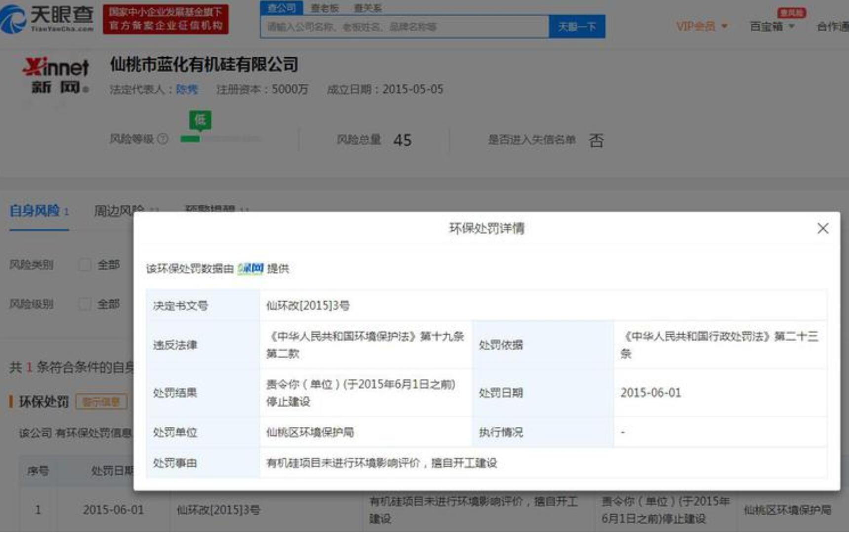 值得注意的是,2015年6月1日,藍化有機硅有限公司因有機硅項目未進行環(huán)境影響評價,擅自開工建設,仙桃區(qū)環(huán)境保護局責令其(單位)(于2015年6月1日之前)停止建設。